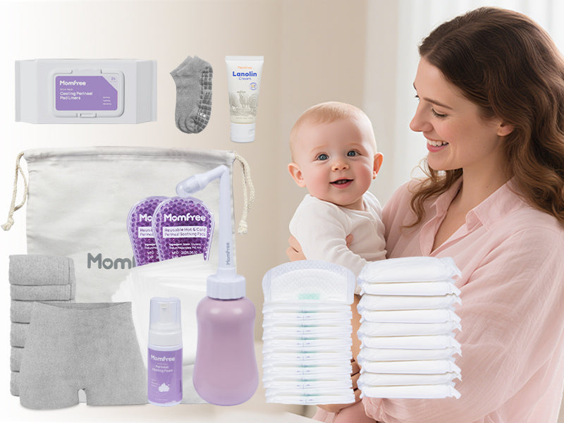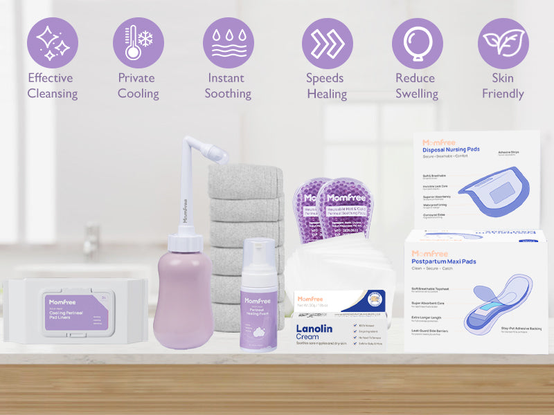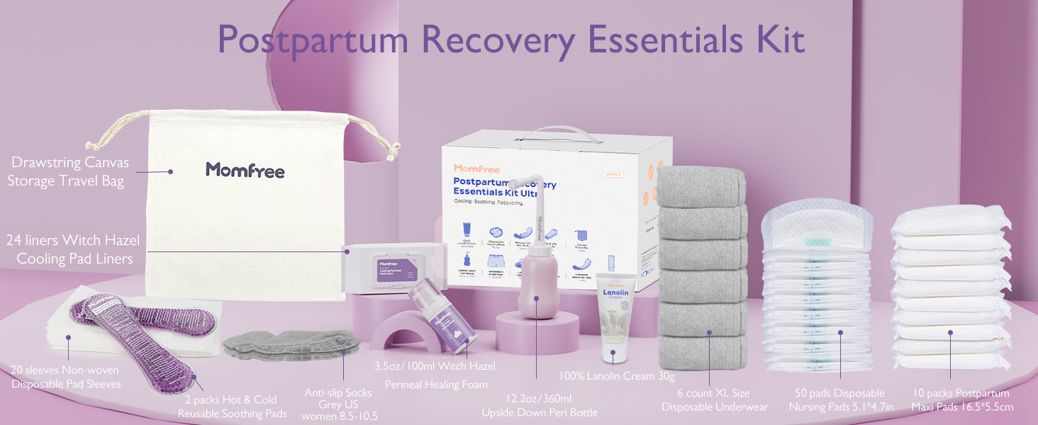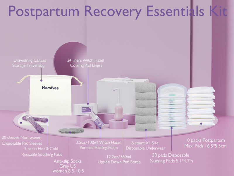 - ONE-STEP POSTPARTUM RECOVERY KIT: Includes 12.2oz upside-down peri bottle,6 counts XL disposable underwear,20 sleeves non-woven disposable pad sleeves,2 packs hot & cold reusable soothing pads,24 liners-witch hazel cooling pad liners,3.5oz witch hazel perineal healing foam, a storage travel bag, 10 packs postpartum maxi pads, 50 pads disposable nursing pads,30g lanolin cream,anti-slip socks. Momfree has everything you need for recovery, making postpartum healing easier and more comfortable.