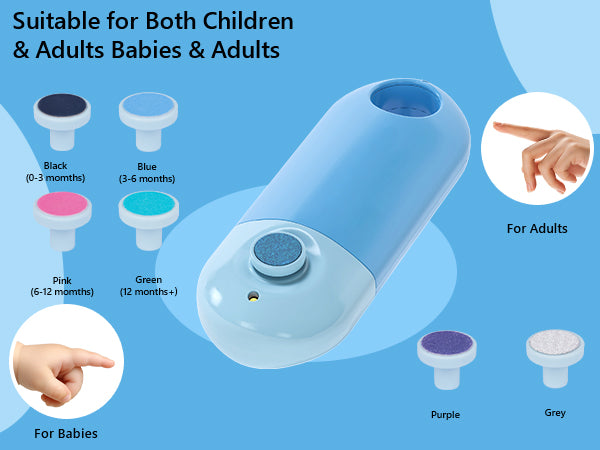 - 6 GRINDING PADS FOR EVERY AGE: This baby nail trimmer set includes 6 replaceable grinding heads to meet the needs of different ages—black for 0–3 months, green for 3–6 months, pink for 6–12 months, blue for 12+ months, and purple and gray for adults. The nail clipper with a large ergonomic handle, non-slip grip, and rounded head design makes it safer and easier to use. The right-side trimming slot is specially designed for curved nails, while the left-side circular polishing head smooths out burrs and shapes nails to be round and gentle.
