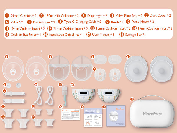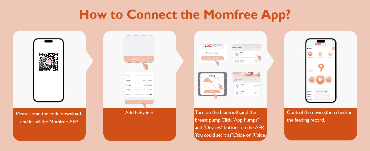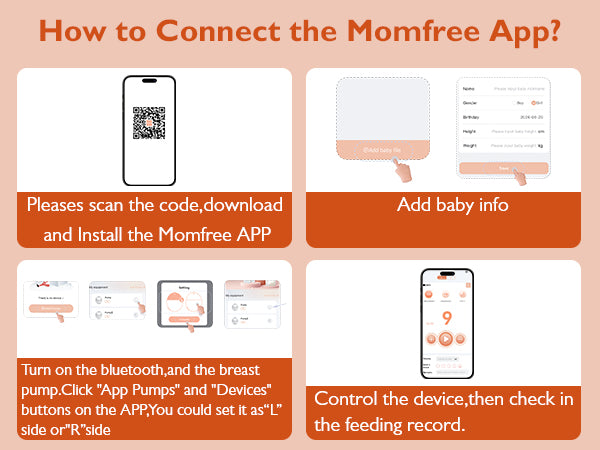 - SMART APP CONTROL PUMPING: With the "Momfree" app, moms can easily monitor and adjust suction levels, track pumping sessions, and set reminders through their smartphones,control your breast pumps remotely ,without reaching into your nursing bra. You can use the app to record your feeding activities and track every breast milk yield, making it easy to observe your baby's growth trends and your pumping history. Get to know yourself better and pump on your own terms.